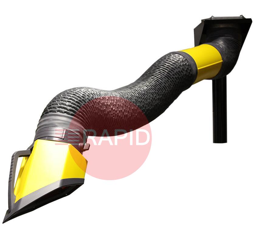 The extraction arm is based on a telescopic tube with counterweight mechanism, allowing it to be extended to give a 2.5m (8.2ft) working radius and compressed to 1.5m (5ft). The arm is fitted with a spring balance which enables it to be moved from a vertical to a horizontal position in one easy movement. If mounted on a column, the arm can be turned through 300° due to the rotating hinge. All movement of the arm is controlled from the hood.