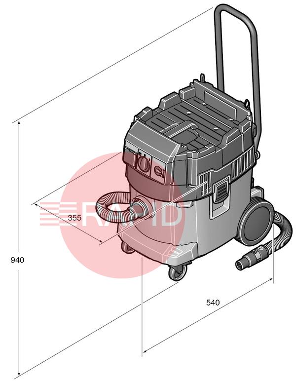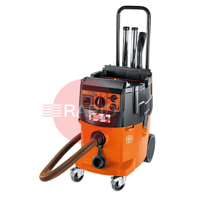 1 push bar, 1 PES flat fold filter, 1 disposal bag, 1x 4 m ES suction hose, diameter 35 mm, 1 tool collar with suction force regulation, 1 stepped collar, 2 suction pipes (metal), 1 combi nozzle with interchangeable inserts, 1 crevice nozzle, 1 suction brush, 1 elbow.