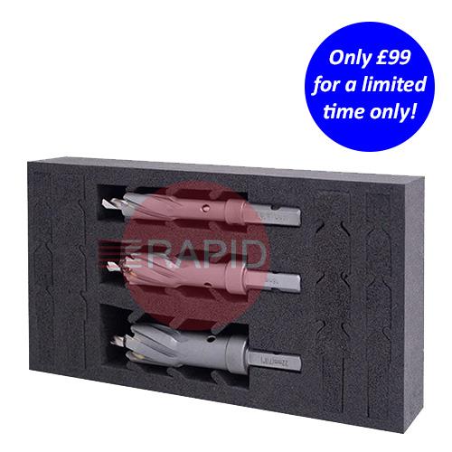 A handy cased set of these ultimate holesaws AT LEAST 10 X LONGER LIFE THAN BI-METAL HOLESAWS. A highly versatile Tungsten Carbide Holesaw system for various power tools, including hand drills, Magnet Drills and Pillar Drills. It is the perfect tool for fabricators and steel erectors needing to drill through heavy steel in locations unsuitable for a magnetic drill. The extended length makes the VersaDrive TCT Holesaw ideal for drilling into steel through existing holes into steel. Premium Tungsten Carbide Teeth for ultimate life - ten times greater than standard bi-metal "Starrett" type holesaws.