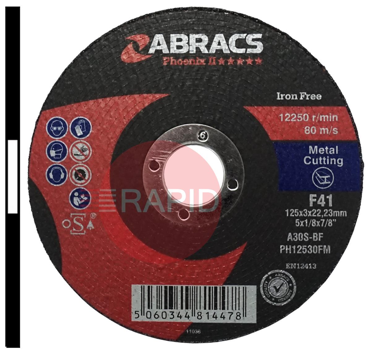Abracs Phoenix II 125mm (5") Slitting Cutting Disc 3mm Thick. Grade A30S-BF for Mild Steel.