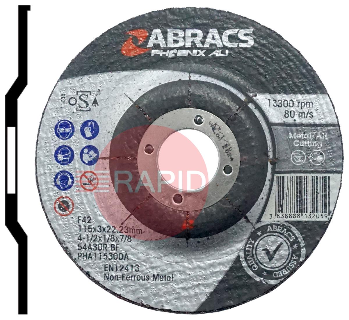 Abracs Phoenix Ali 115mm (4.5") Depressed Centre Cutting Disc 3mm Thick. Grade 54A30R-BF For Aluminium.