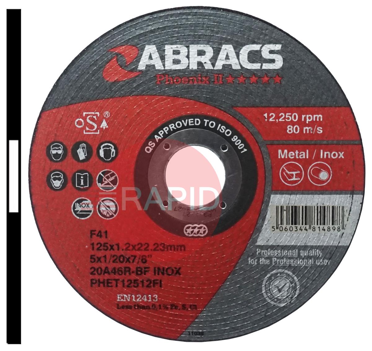 Abracs Phoenix II 125mm (5") Slitting Cutting Disc 1.2mm Thick. Grade 20A46R Inox-BF For Steel & Stainless Steel.