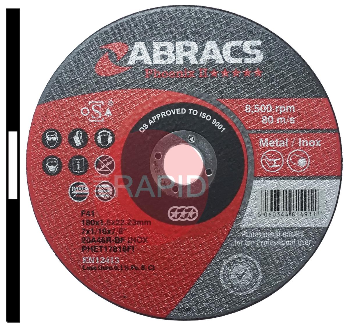Abracs Phoenix II 180mm (7") Slitting Cutting Disc 1.6mm Thick. Grade 20A46R Inox-BF For Steel & Stainless Steel.